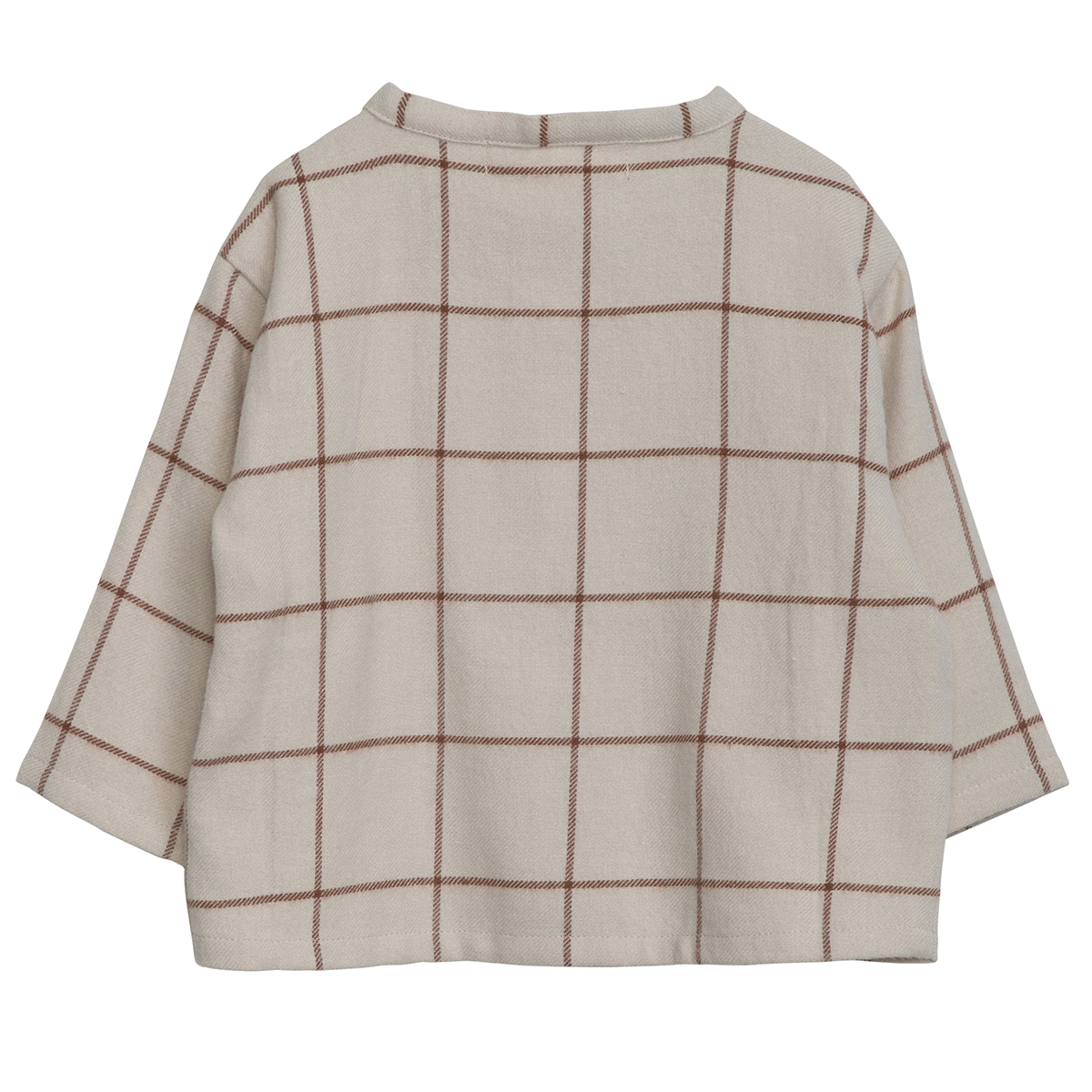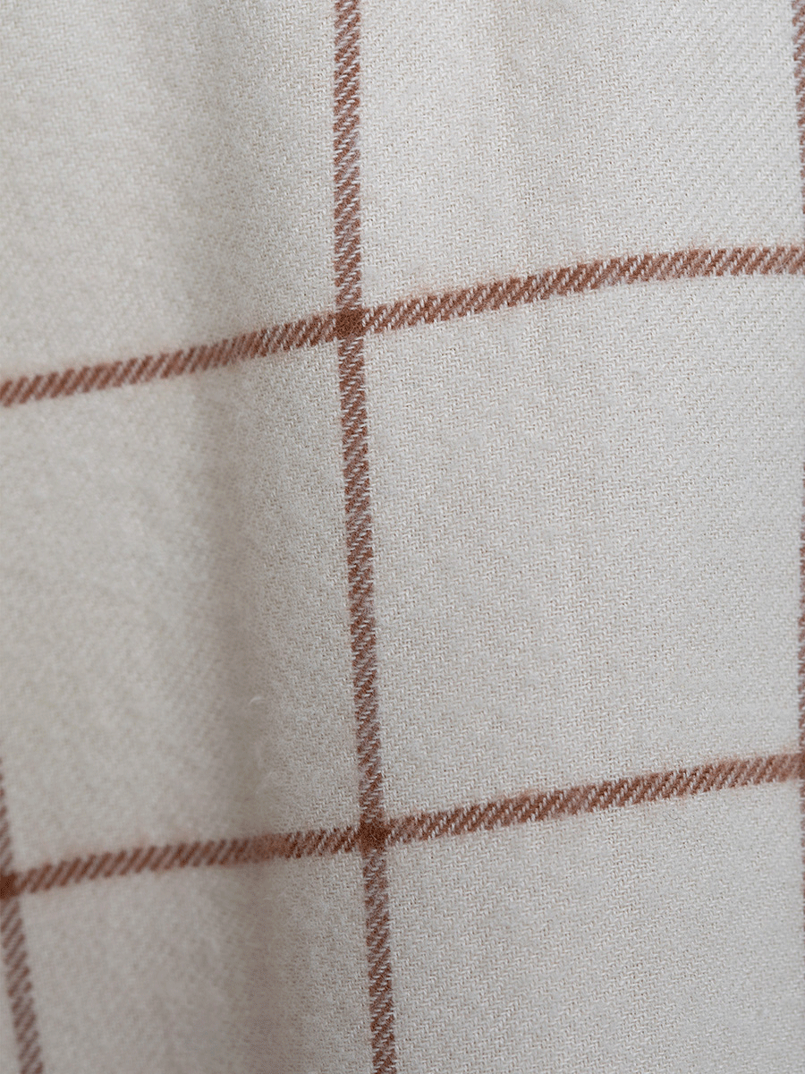 Woven in chocolate brown and creme coloured checks. Buttons are coconut.