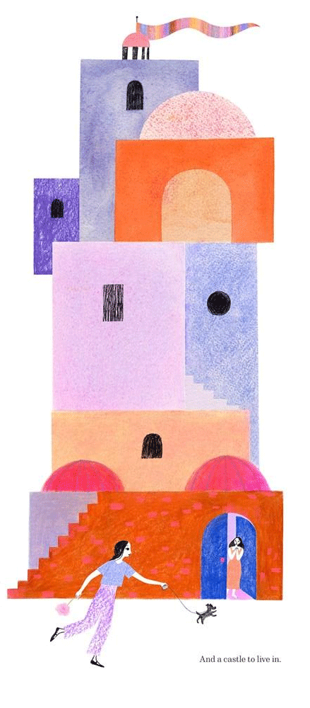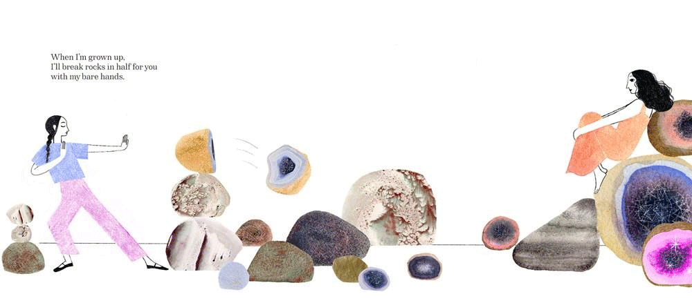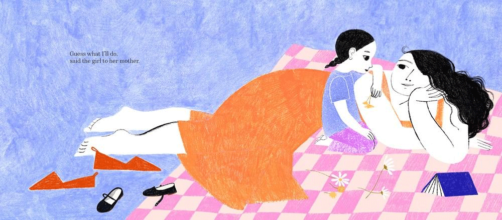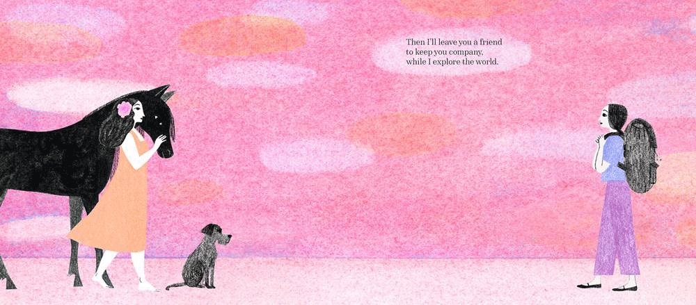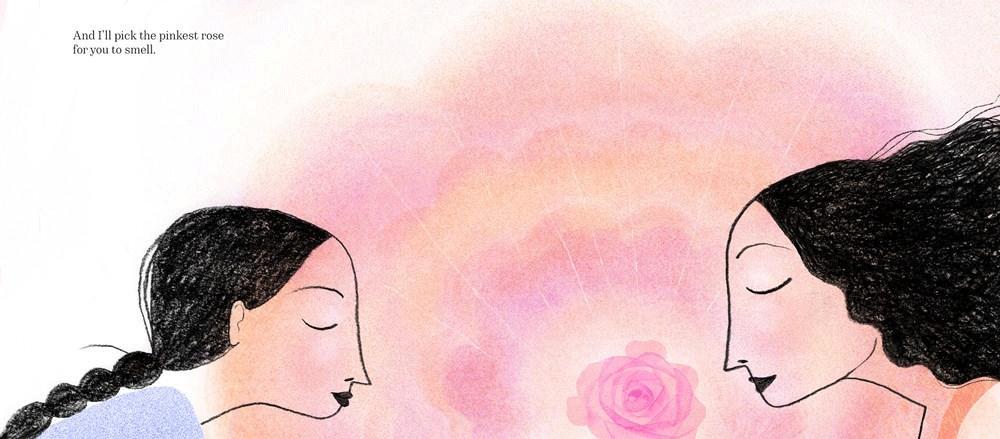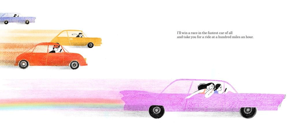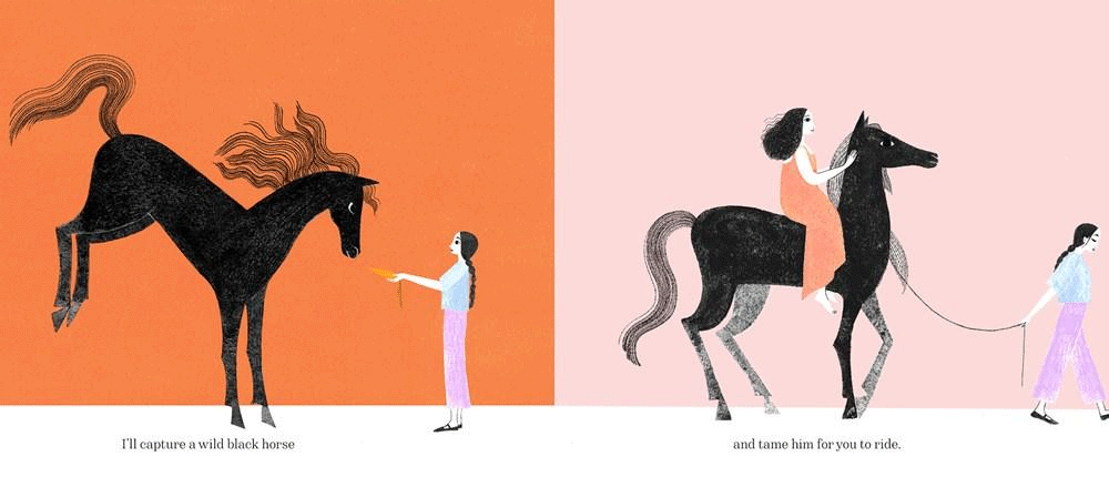 A girl declares all the things she’ll do for her mother when she is all grown up—from climbing mountains and swimming across oceans, to picking the pinkest rose, to building the biggest bridge and a castle for her mother to live in, to taming a wild black horse for her mother to ride—ending with the friend she will bring her mother to keep her company while she travels the world.