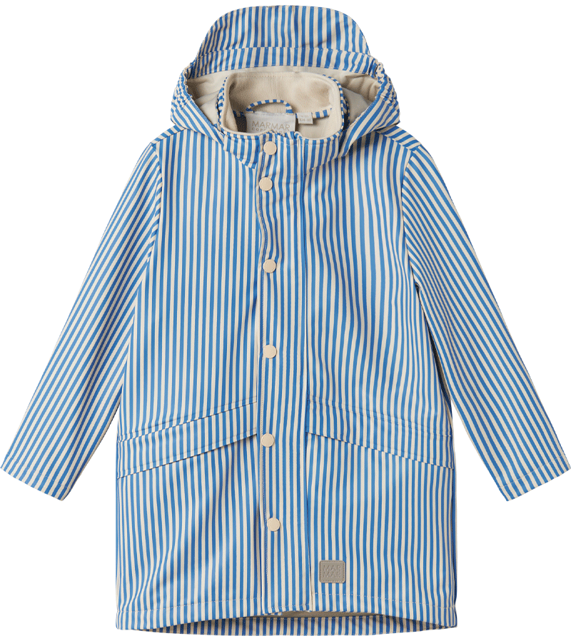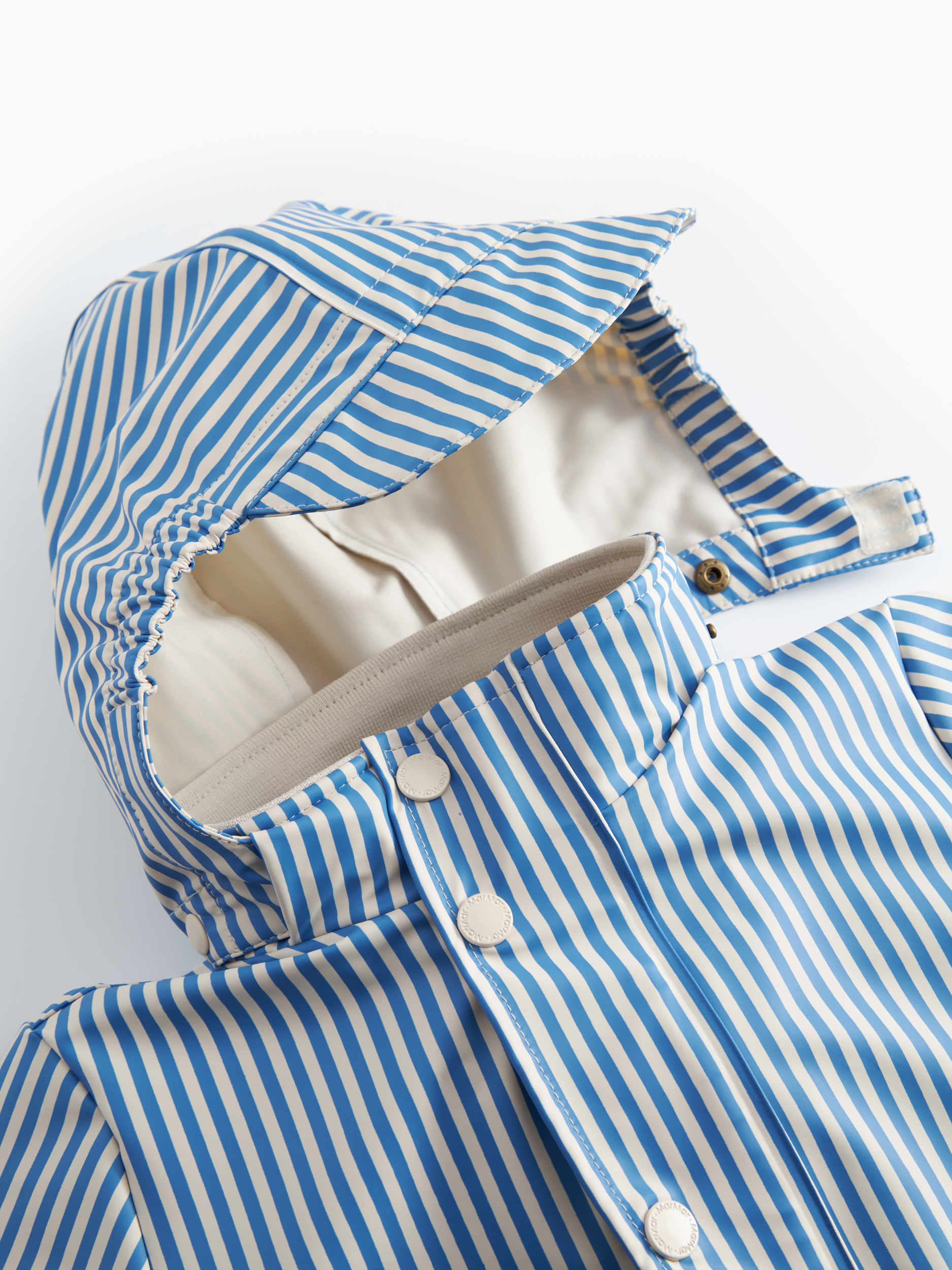 The lightweight construction makes it easy to wear over everyday outfits, while the waterproof coating helps protect against rain and drizzle without feeling heavy or stiff. The classic blue stripe design gives the jacket a timeless, playful look that works just as well for school days as weekend adventures.