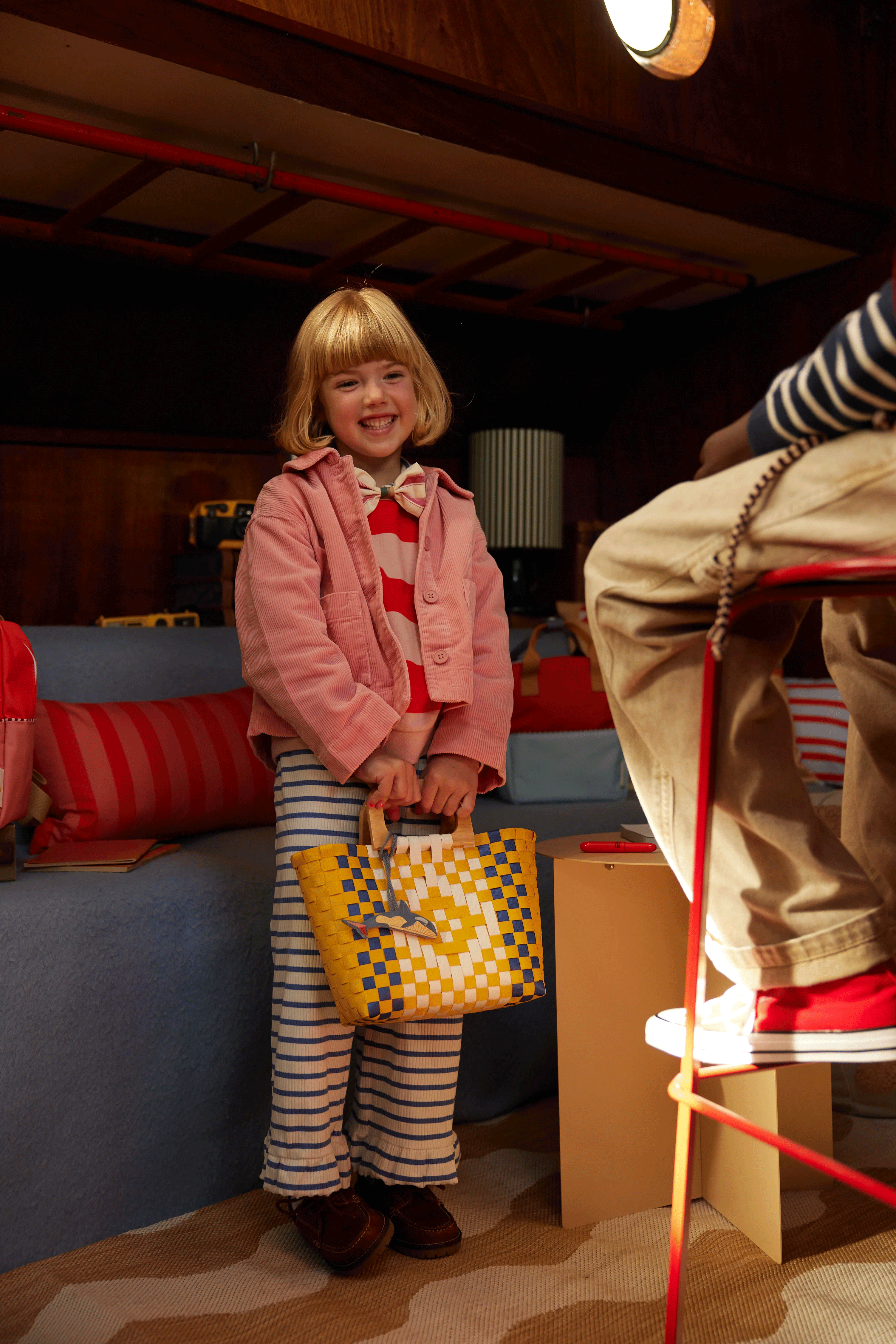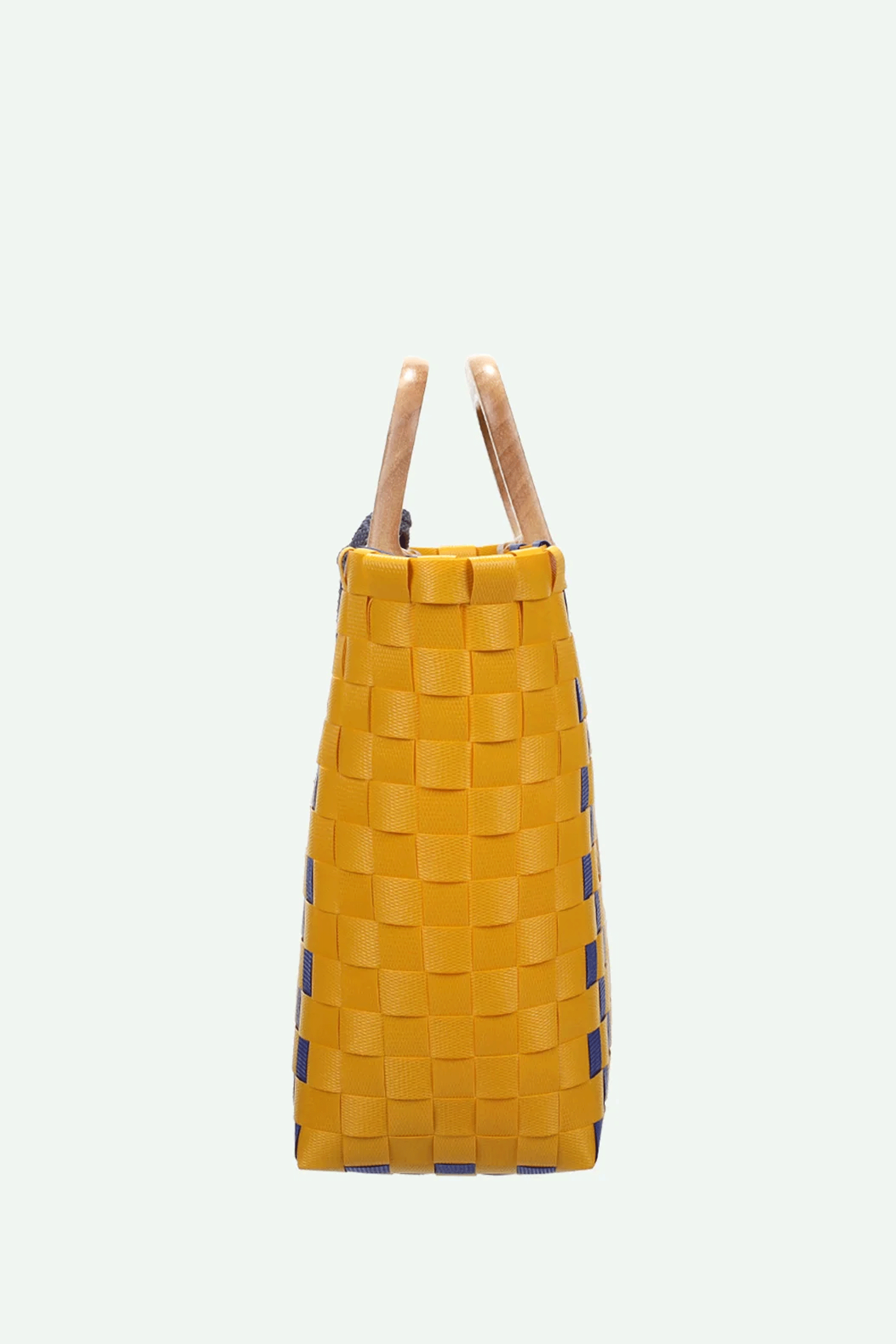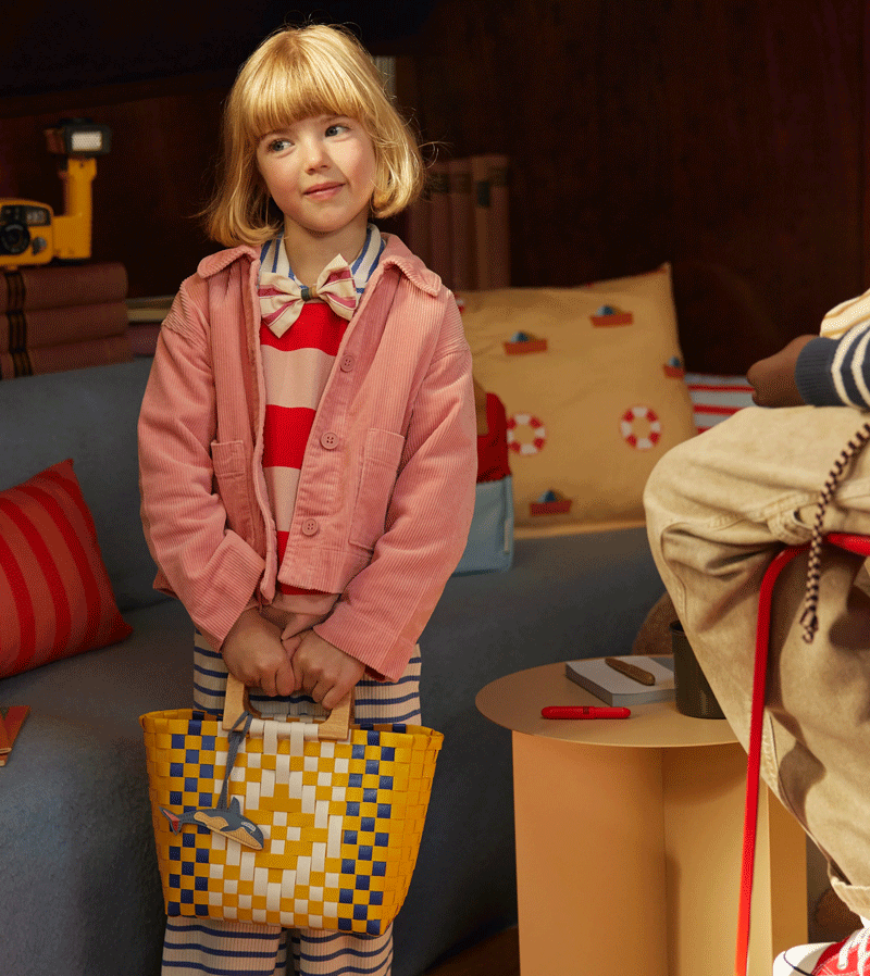 Take this beautiful basket with you, for a lunch at the beach or just to store all your treasures. It's woven, with a wooden handle.