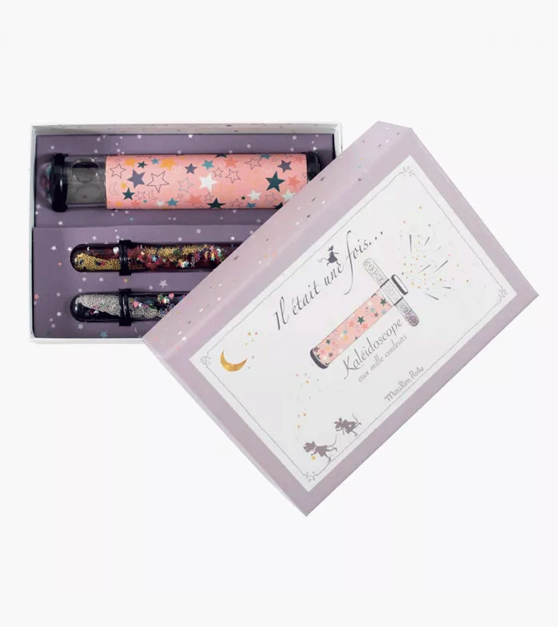 A wonderful gift! Illustrated box including a starry kaleidoscope with 2 sliding tubes containing gel and glitter which, combined with the small mirrors of the kaleidoscope, infinitely multiply the combinations of shapes and colors.