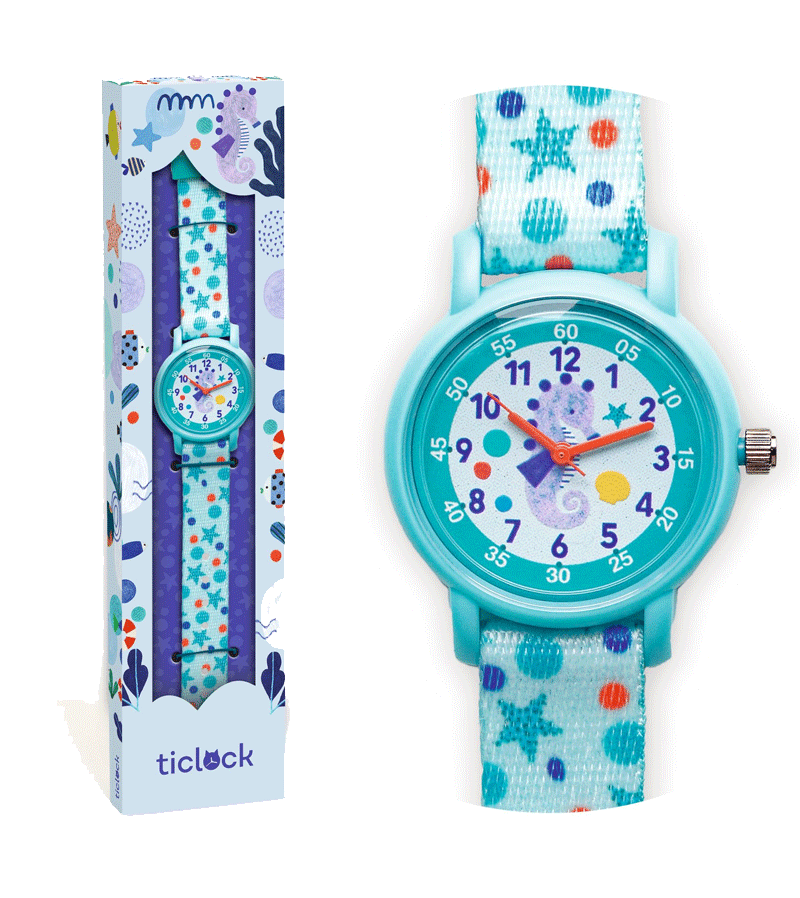 An elegant ocean-themed quartz watch for learning to tell the time. An educational watch with two distinct dials (one for the hours, the other for the minutes) and slim hands for easy time reading. Thanks to the Japanese Miyota 2035 movement, the hands are silent. A watch with a shockproof case and water-resistant up to 3 bar. Works with 1 SR626SW battery included.
