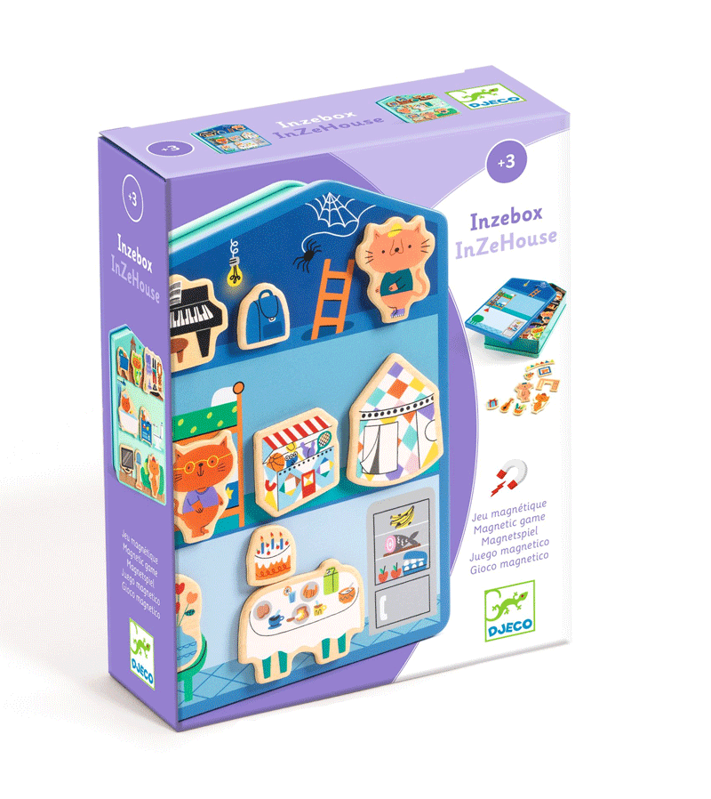 Inzebox, the child plays with wooden magnets on a metal box in the shape of a house to have fun animating and decorating the 6 rooms (the attic, the bedroom, the kitchen, the living room, the bathroom and the playroom)!
