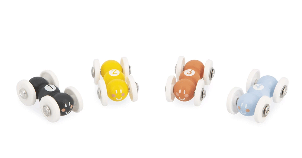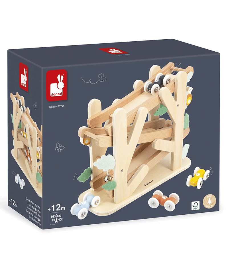 Ants race! With this wooden descender, intrepid ants from 12 months can race down the slope. An ideal early-learning toy for developing baby's fine motor skills and understanding of cause and effect, our ant descender comes with 4 different-colored rollers. In turn, the ants launch themselves from the top of the hill, hurtling through the foliage, finishing their run with a fanfare thanks to the bell at the end of the course. Baby won't tire of putting his favorite ant down at the very top and watching it descend again and again over 3 levels! A simple, effective mechanism for an original, whimsical toddler toy. We love the natural wood of the stand, the little garden creatures that decorate it and the felt leaves that add an interesting sensory touch. The rolling ants are numbered, like real racing cars, and are easy to handle. The tinkling bell on the finish line adds a sonic dimension to this pretty baby descender. From our Sweet Cocoon collection, it's made of wood from sustainably managed forests, FSC™ certified. So, who's the fastest black, yellow, blue or brown ant?