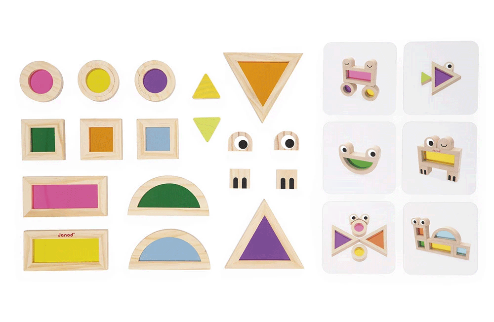 Translucent blocks for a colorful view of life! With this set of 18 sensory blocks, children from 12 months develop their fine motor skills and imagination. It's the first stacking game for little ones! Supplied with 6 model cards, these colorful blocks can be used to create a whole host of funny animals and characters. 12 transparent geometric shapes are included (orange, pink, yellow, purple, blue and green) and 6 wooden blocks are printed with eyes, paws or ears. Children love looking at the world through the translucent shapes! From an early age, they stack the shapes like a construction set and learn to recognize colors. As they grow and progress, they learn to follow the models, then imagine their own creations. This sensory toy also stimulates sight, and uses wood and colors to create a fun and easy learning experience. Made from FSC™-certified wood from sustainably managed forests, this set of translucent blocks is part of our "Sensory" range: highly grippable, sturdy toys that encourage and stimulate the development of toddlers' senses.