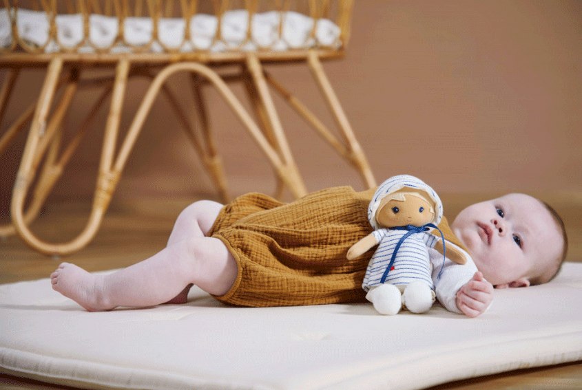 The doll measures 9,75 inches and is suitable for babies from birth. Eli loves touching, climbing and jumping in the sea, as evidenced by her light, casual outfit.