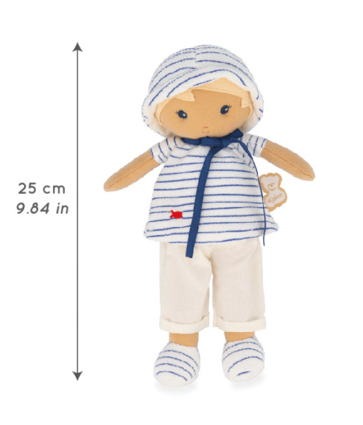 This doll wears a sailor top with  contrasting stripes that will be easy for young children to spot. Its  delicate fish embroidery is a reminder of the sea and the ocean, the  element Eli prefers to play in. Eli's baggy trousers are easy for  youngsters' clumsy hands to grasp. Thanks to its elegant hat, Eli is not  afraid of sunburns. Around its neck is a pretty ribbon on which you can  write baby's name.