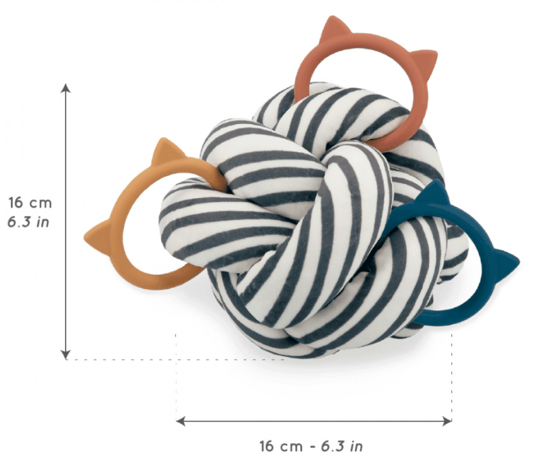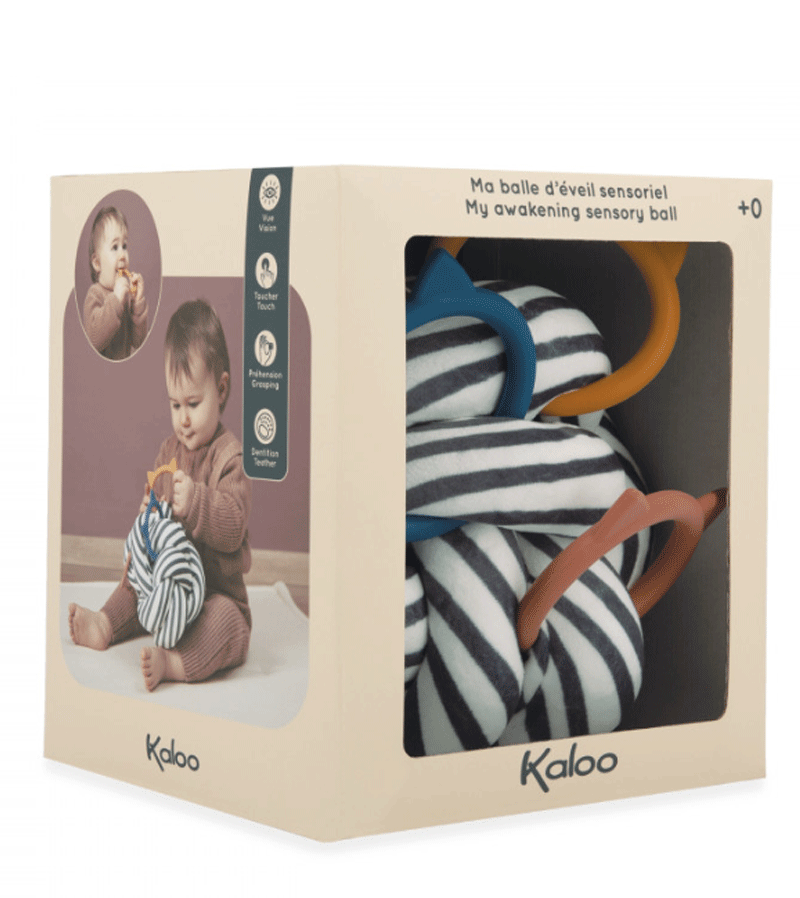 A knot-shaped ball dedicated to baby's sensory development! Suitable from birth, this ball helps stimulate baby's sight, touch and grip. For this, it has an original shape made of intertwining, which makes it easy for baby to grasp and encourages their fine motor skills. In addition, these captivating contrasting patterns help stimulate your little one's eyesight, who can better perceive contrasts at birth. Finally, 3 rings in the shape of cats give an additional dimension to this developmental toy: in various colors, they are made of silicone and can be removed and replaced on the ball as you wish. Changing their place on the ball regularly allows you to continually arouse baby's curiosity, who will love grabbing them! They also serve as teething rings, always useful to soothe baby's sore gums when teething. This activity toy measures 16 cm and will be ideal as a gift for a birth. It contributes to the development of baby's senses, gently and at their own pace. Soft and comfortable, the ball is made of micro-velvet (polyester) and is padded with recycled polyester. You can machine wash the set at 30° for easy care. Now complete the space dedicated to baby's exploration with a soft developmental toy designed especially for him by early childhood experts! This sensory awareness ball is part of the Stimule range from KALOO, developed in collaboration with psychomotor therapists to help baby develop their sensory and motor skills from birth.