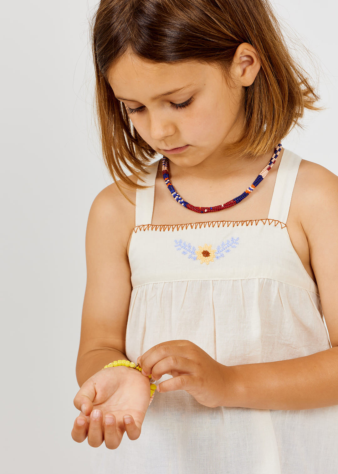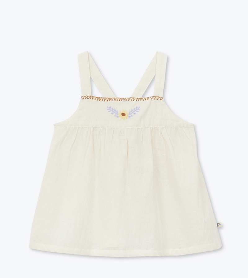 This embroidered strappy top is a light and delicate piece, perfect for warm sunny days. With its airy fabric and charming embroidery, it brings a soft, timeless look to your little one’s outfit.