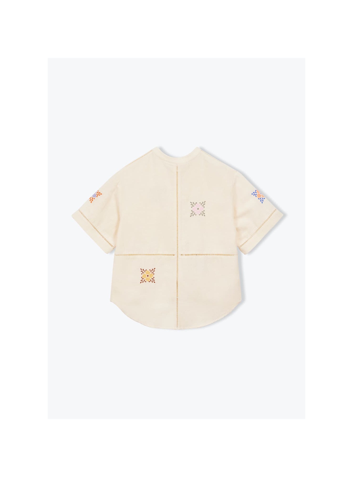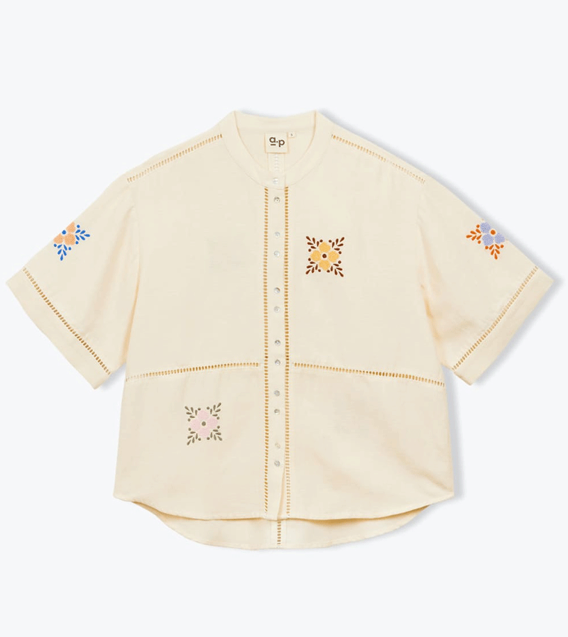 This women’s embroidered blouse is a light and elegant piece that combines delicate details with effortless comfort. The soft textured cotton and colorful floral embroidery give it a refined yet relaxed feel, perfect for warm days.