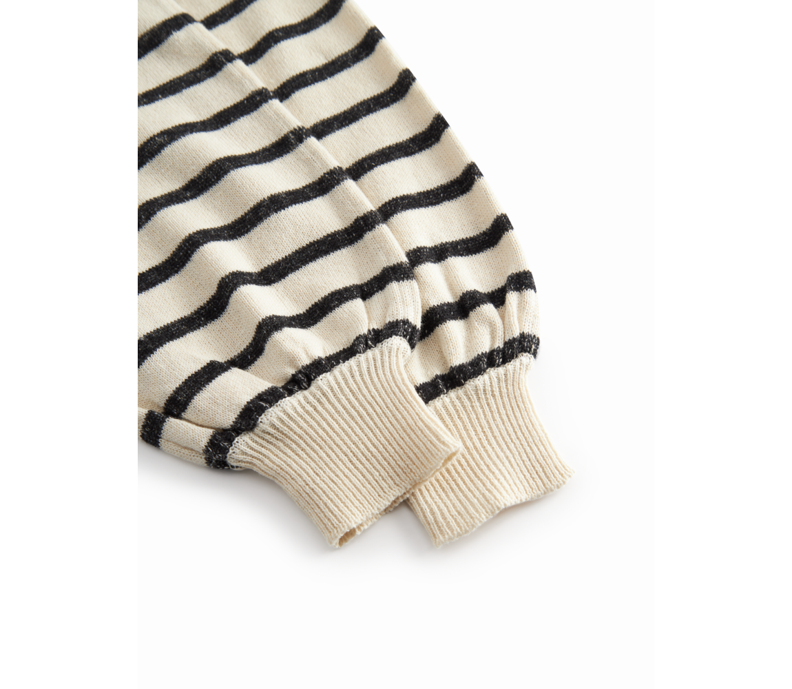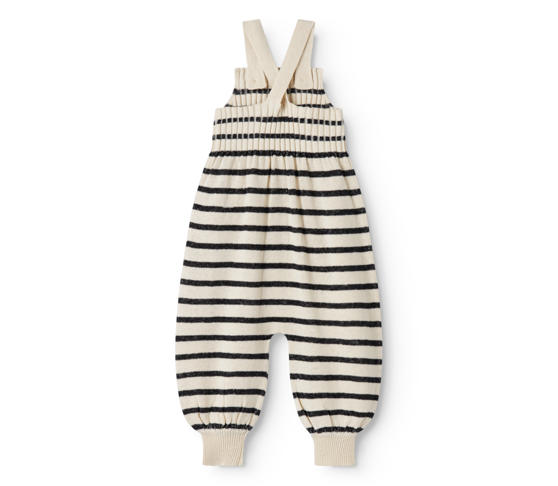 Knitted jumpsuit for the little ones with stripes and adjustable straps that cross at the back. The jumpsuit has ribbed knit at the top and at the legs, which gives a comfortable and flexible fit. The jumpsuit closes with buttons at the front on the straps in two lengths.