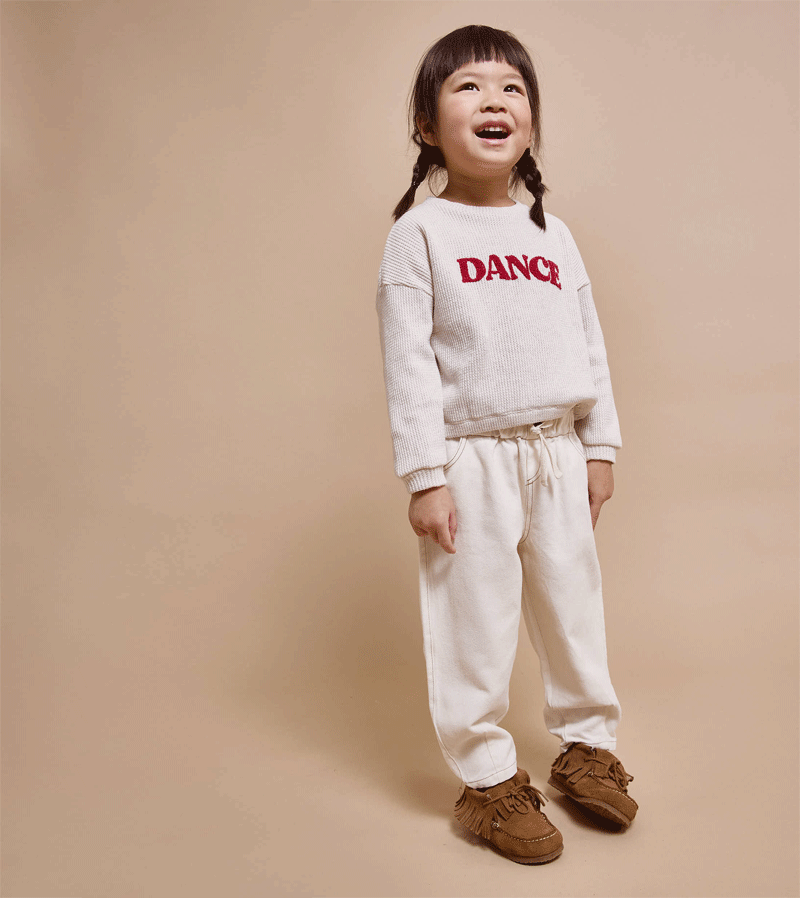 Stay cozy and stylish with this charming waffle knit sweatshirt, featuring a bold red DANCE motif across the front.