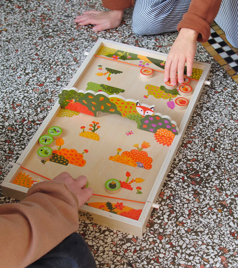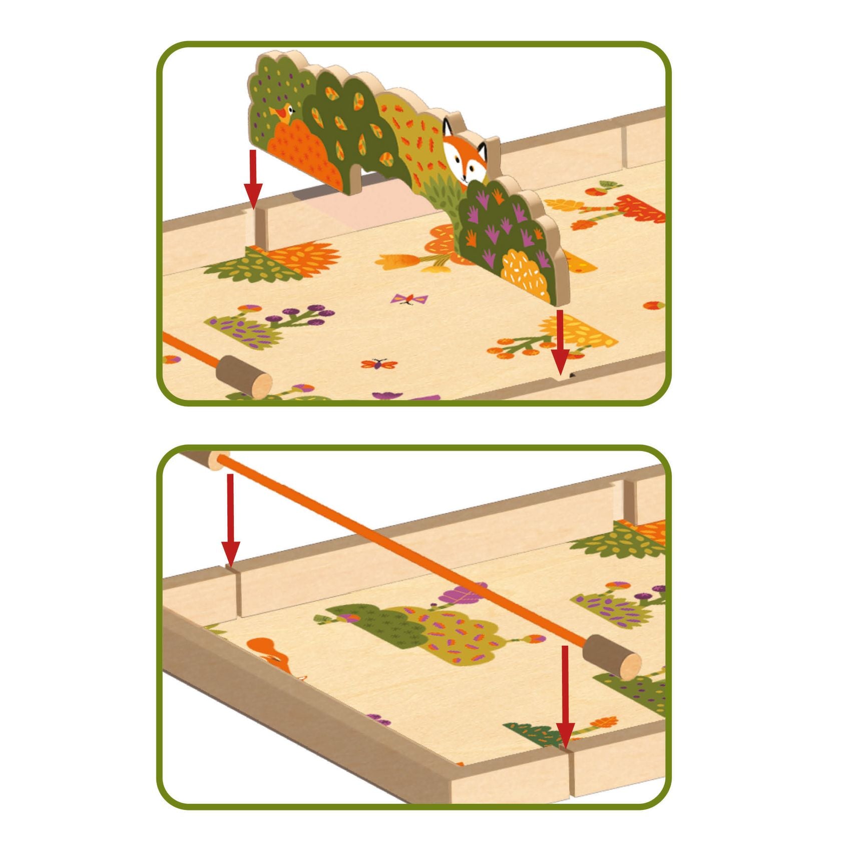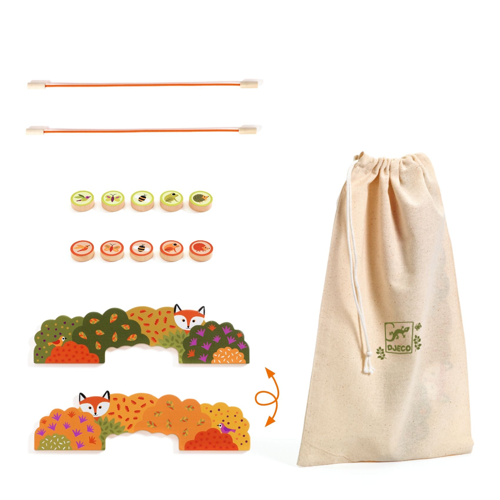 1 large double-sided wooden game board (50 cm long), 1 bush obstacle, 2 elastic fabric threads, 10 wooden animal discs, 1 illustrated set of game rules, 1 cotton storage bag.