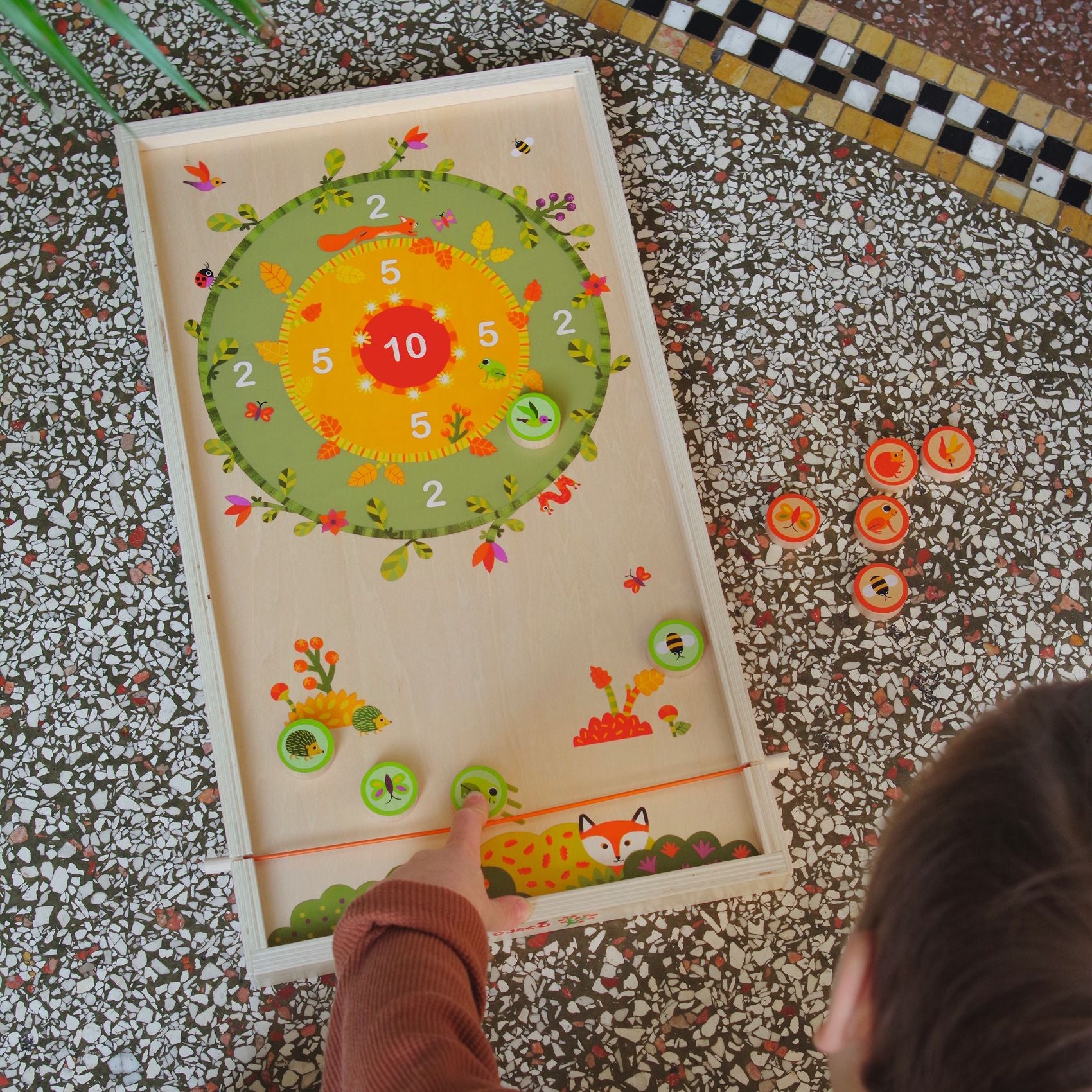 Two classic games in one, combining dexterity, reflexes and spacial awareness. This big double-sided wooden game board, designed for young players from 4 years, offers a choice of playing a shuffleboard game or a target game. On one side, the children slide their discs through the bush obstacle to reach the opposing side, and on the other, they aim at targets to increase their score. Two updated games that encourage playing together and sharing! Includes a cotton bag to easily store everything so nothing gets lost.