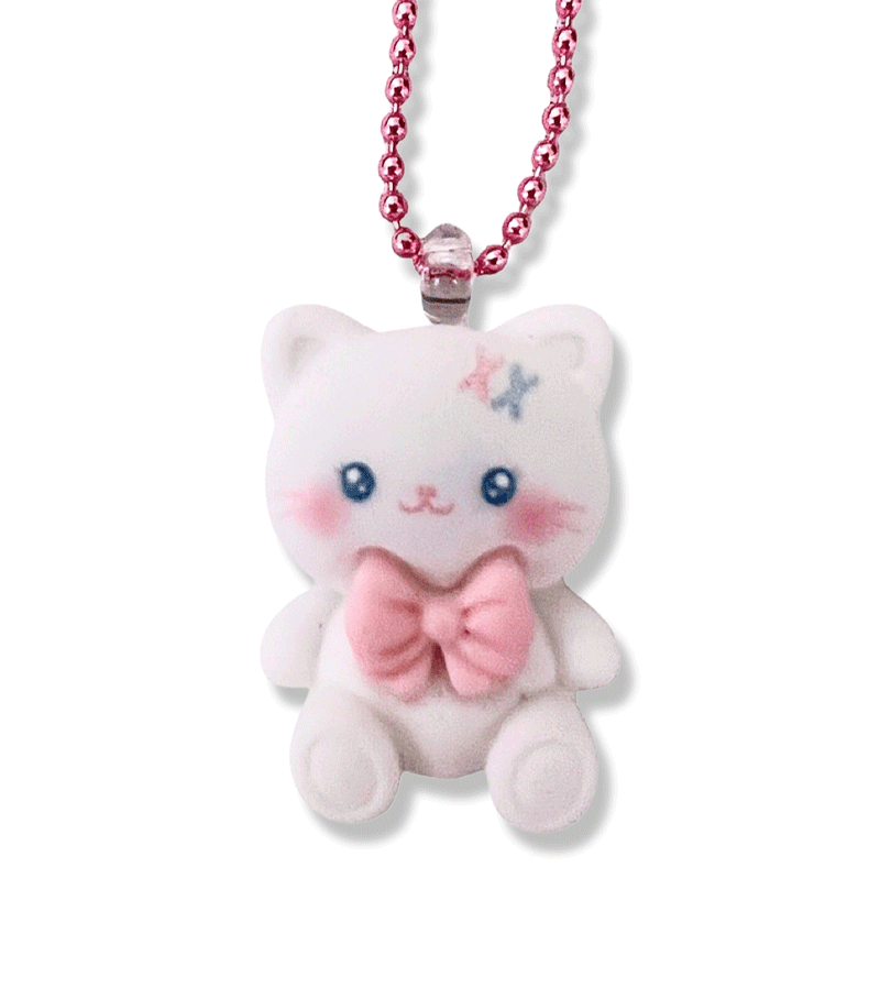 The cutest little white kitten with a pink bow as Pendants in our colored ball chains.