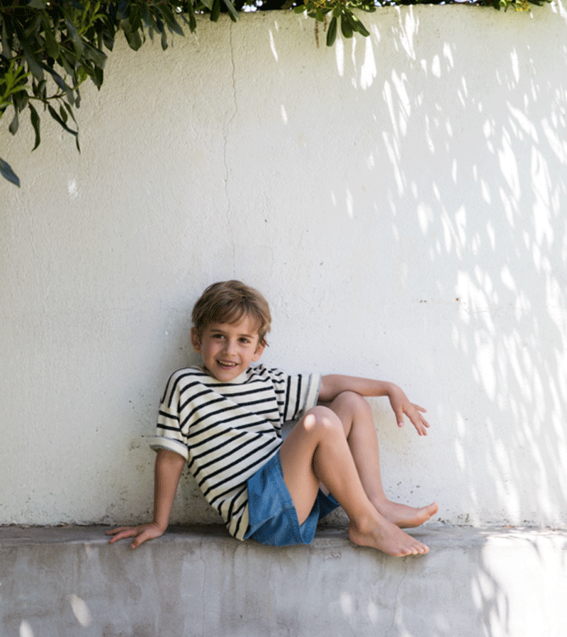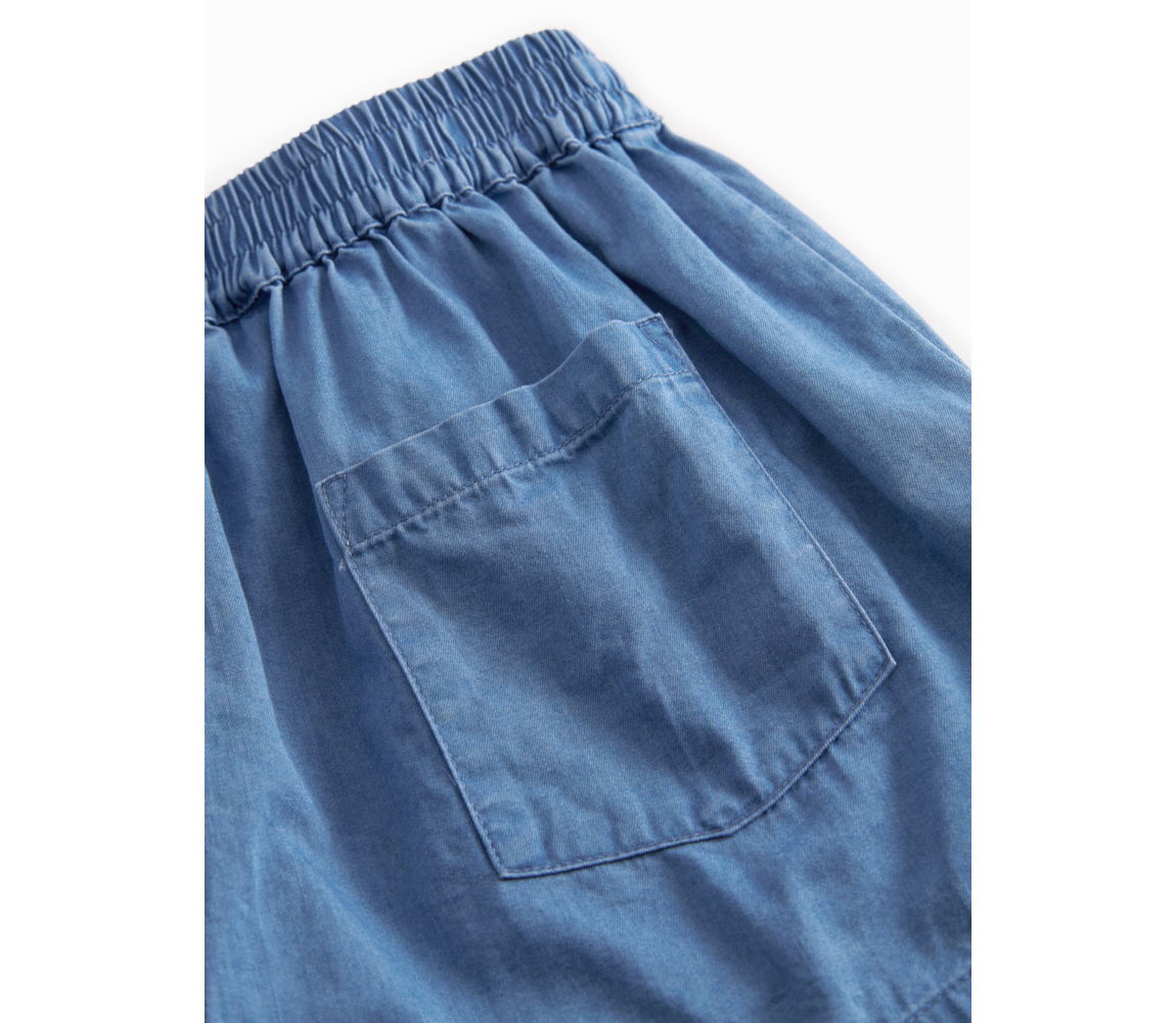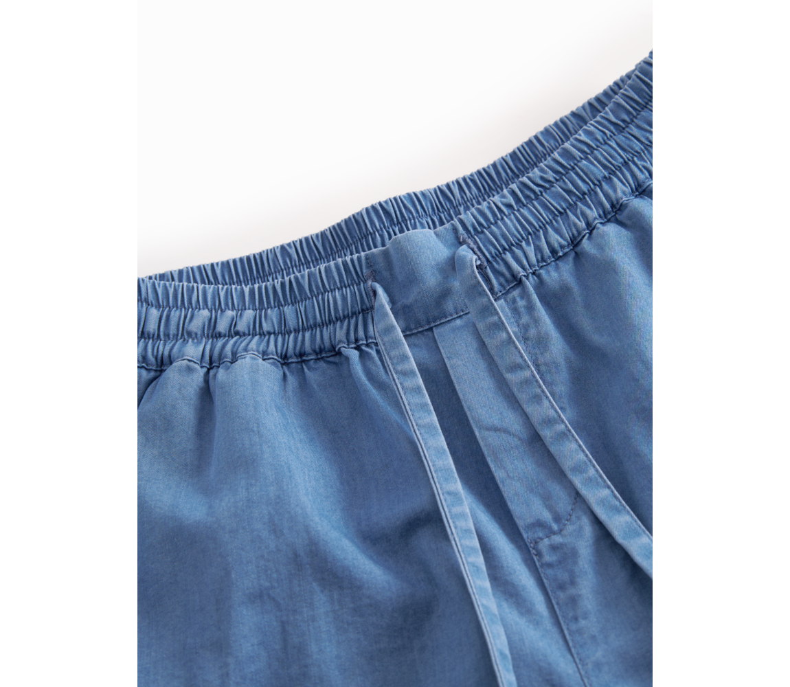 Denim shorts with side pockets and elastic waistband with tie. The shorts are made of soft and comfortable cotton with a delicate texture.