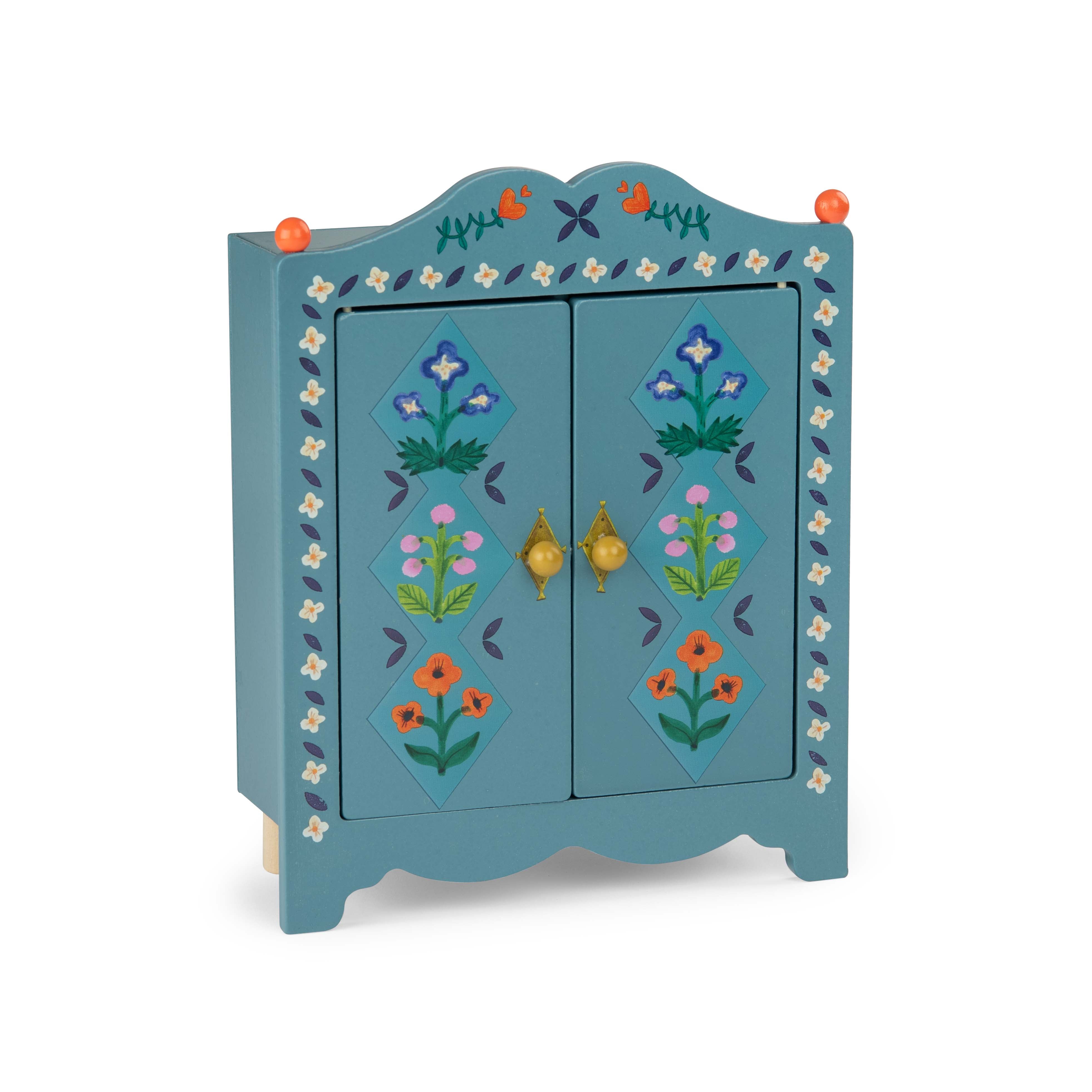 Wooden wardrobe with magnetic closure and 3 hangers.