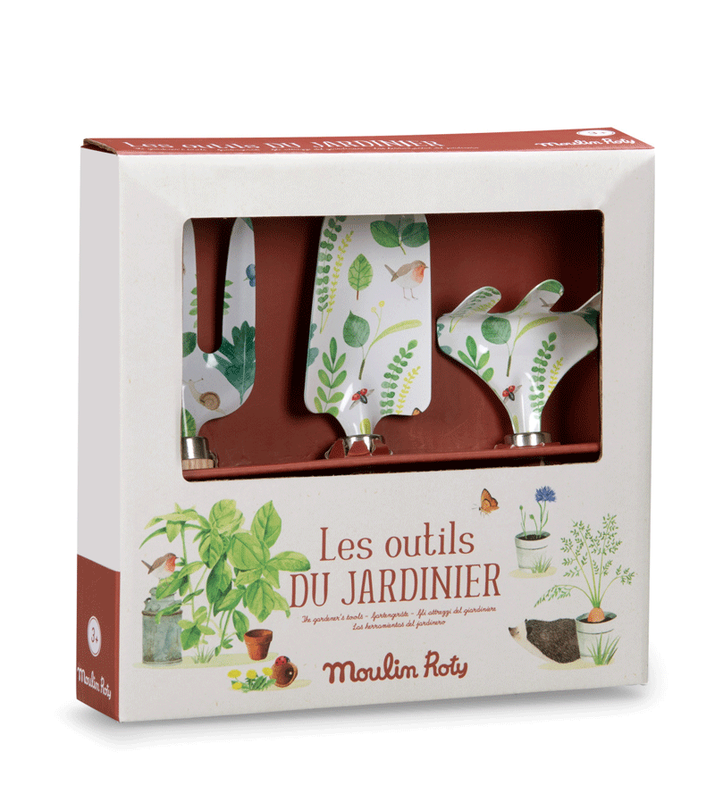 Le Jardin Set of 3 Gardening Tools by Moulin Roty is a children's set from the Le Jardin du Moulin collection, featuring a metal trowel, rake, and fork.