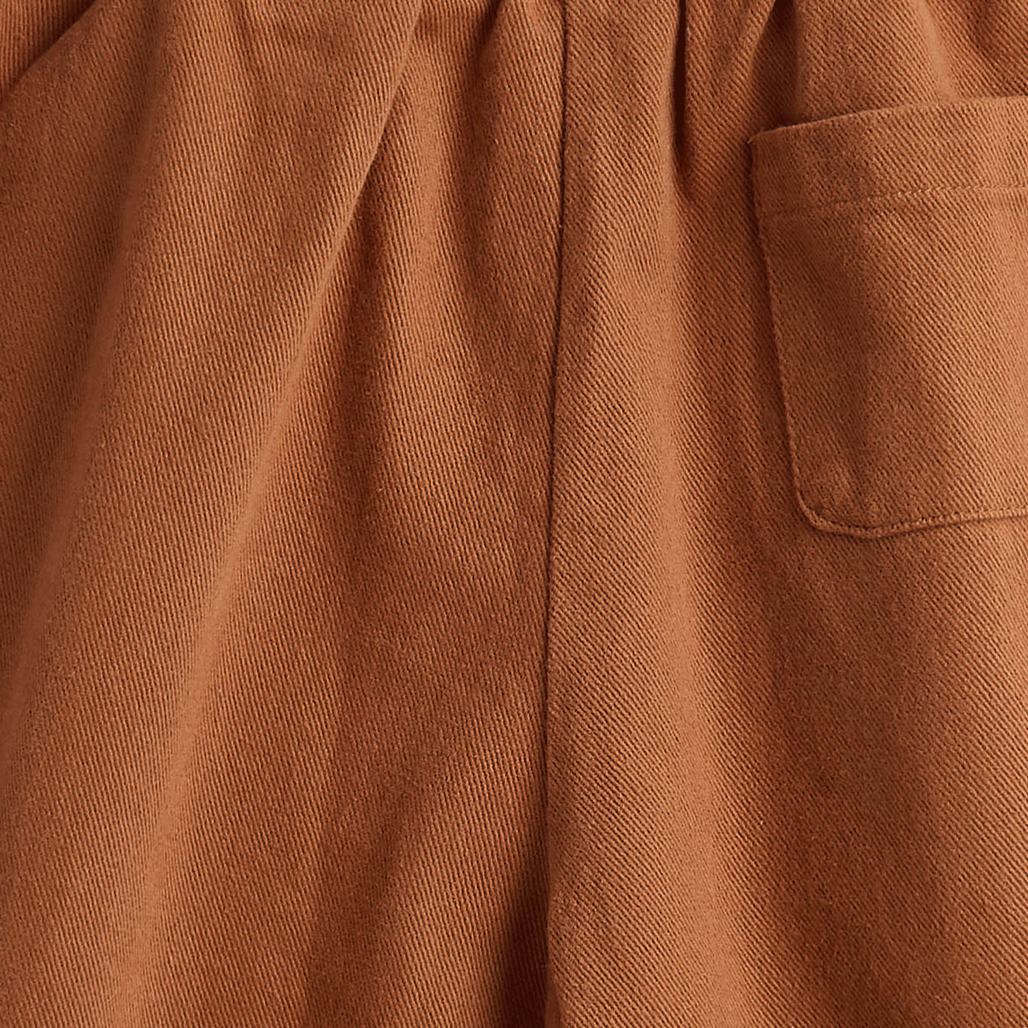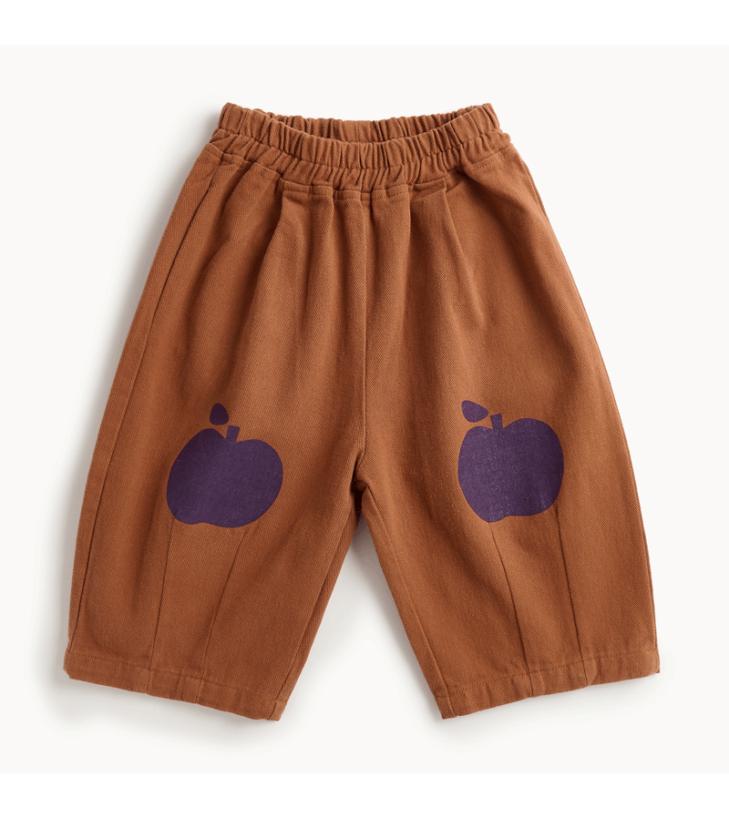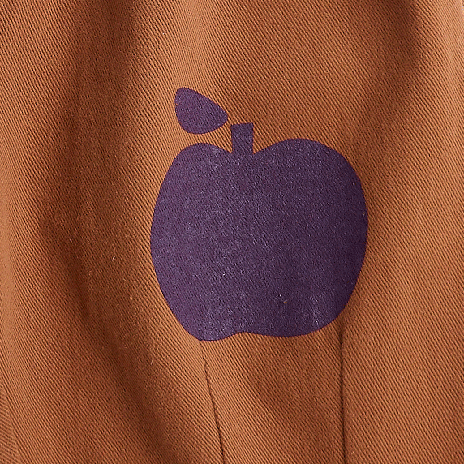Sturdy woven trouser in Ginger with placed purple apple printed knees.
