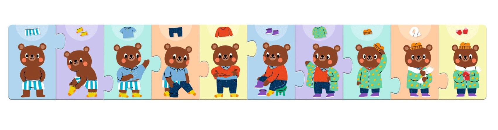 Teddy Bear Gets Dressed is a 10-piece frieze puzzle to put in order to learn the steps of getting dressed.