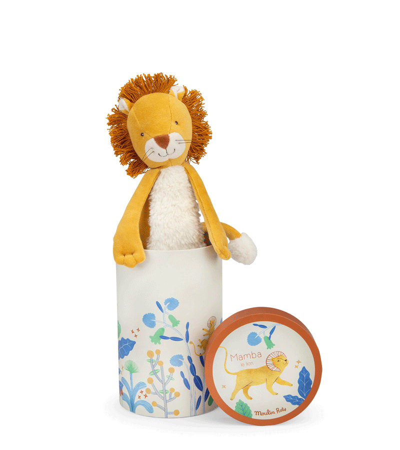 La forêt Mawa Mamba the Lion is a central character in the La Forêt Mawa collection by Moulin Roty, featuring a range of baby toys including comforters, dolls, and musical plushes.