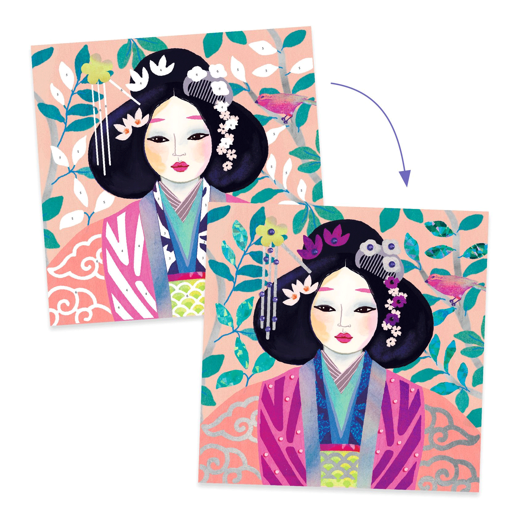4 illustrated and pre-glued cards (20 x 20 cm), 1 colorful assortment of metal sheets to apply, self-adhesive rhinestones, 1 step-by-step instruction booklet.