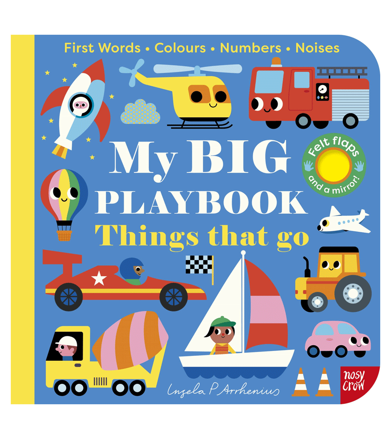A BIG book for sharing with a little person, introducing things that go, first words, colours, numbers and more – with felt flaps and a mirror!
