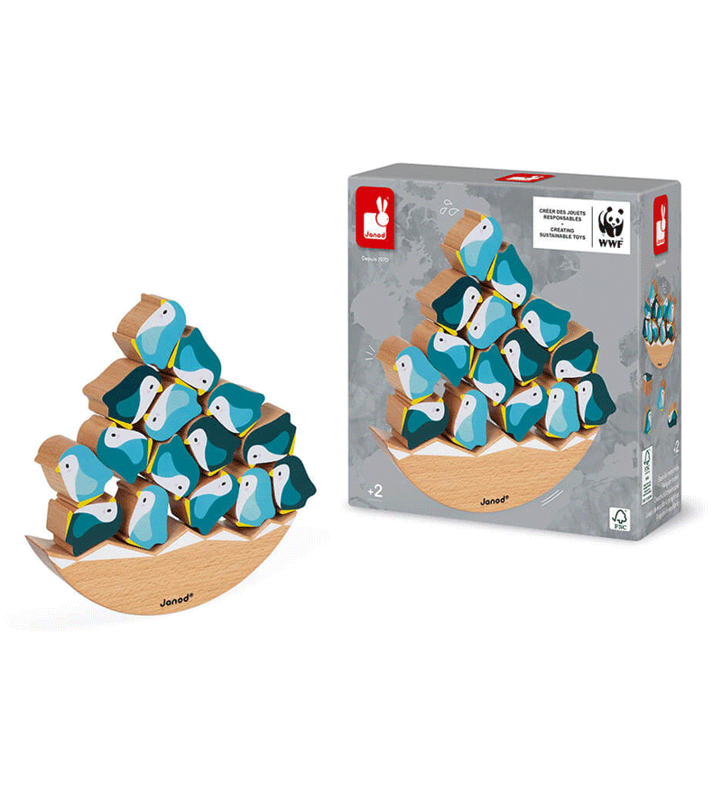 There isn’t enough space on the ice, but our balancing penguins are all determined to settle there, even if they make everything topple over! This balance game is made up of a natural wood iceberg and 15 very cute penguins in polar colours. Children aged 2 and over will be able to defy the laws of gravity by trying to squeeze as many penguins as possible onto the ice! This game can be played solo or with friends. FSC®-certified solid wood toy (from sustainably managed forests) Water-based paint. Did you know? Penguins can’t fly, but they are excellent swimmers, and can it can survive temperatures as low as -40° Celsius! Toy developed in collaboration with WWF®. Janod is supporting WWF®™’s efforts to protect the environment and biodiversity with a new range of toys made from more sustainable materials. We hope this range will inspire the next generation and encourage them to stand up for wildlife and the natural world in the future.