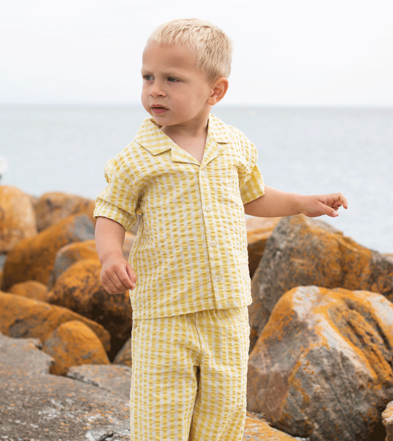 Checkered short sleeved summer shirt in seersucker woven organic cotton. Lemon white Checks  design with large collar and push buttons for opening. GOTS certified.