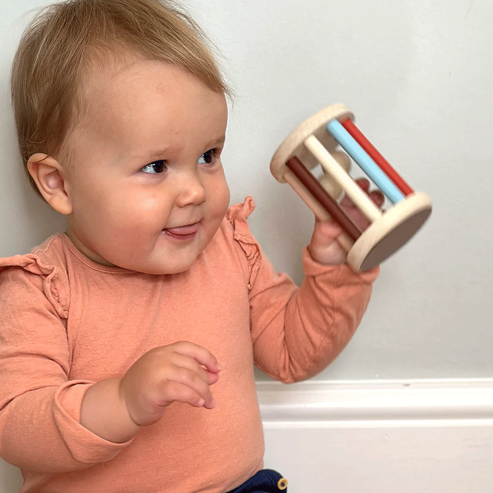 This wooden toy rattle comes with 2 wooden balls held inside a wooden rattle. Decorated with a kitten motif.